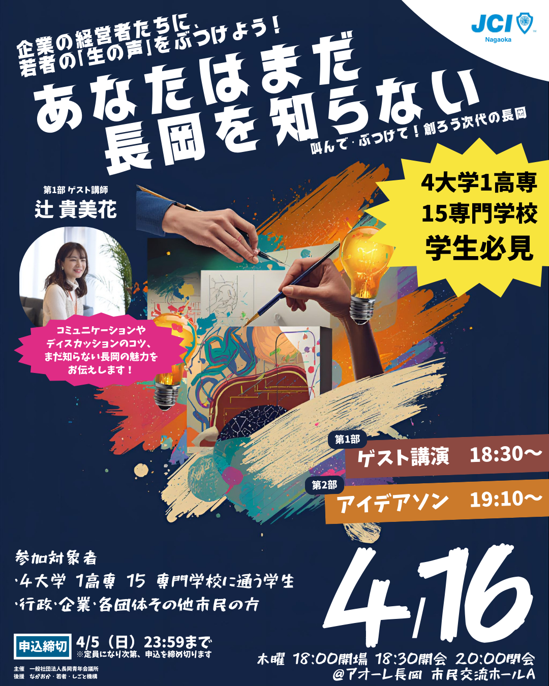 我々長岡青年会議所は、若者と長岡の企業、行政、団体が互いの熱量や本音をぶつけ合い、相互理解を重ね、深く繋がる機会を創出することで、長岡の魅力や長岡で活躍する可能性を見出し、若者に選ばれるまちを目指し、4月公開例会「あなたはまだ、長岡を知らない〜叫んで・ぶつけて!創ろう次代の長岡〜」を開催いたします。